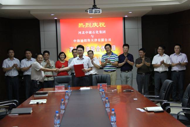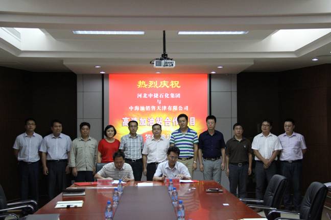 8月29日下午,在新啟元科研樓三樓會議室,河北中捷石化集團與中海油銷售天津公司舉行高層洽談會暨沿海高速服務區加油站合作項目簽字儀式。會議由中捷石化集團監事會主席伊國東主持,中捷石化集團常務副總經理劉國新、中海油銷售天津公司總經理馬國東出席并作講話。華辰石油公司總經理馬強與中海油銷售天津公司副總經理孫昊分別代表雙方在合作協議上簽字。