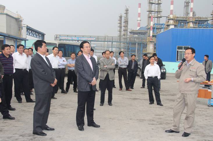 在蒽油加氫項目現場,集團總經理于國臣就蒽油加氫項目建設情況向來訪領導進行了匯報,重點說明了項目建設的進度和意義。市委市政府領導在聽取匯報后對此給予了高度評價。
