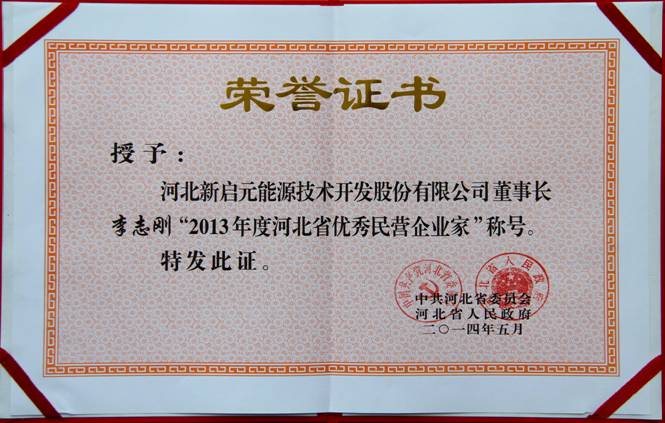 6月5日,中共河北省委、河北省人民政府授予新啟元公司“河北省2013年度百強民營企業”榮譽稱號。授予新啟元公司董事長李志剛“2013年度河北省優秀民營企業家”榮譽稱號。
