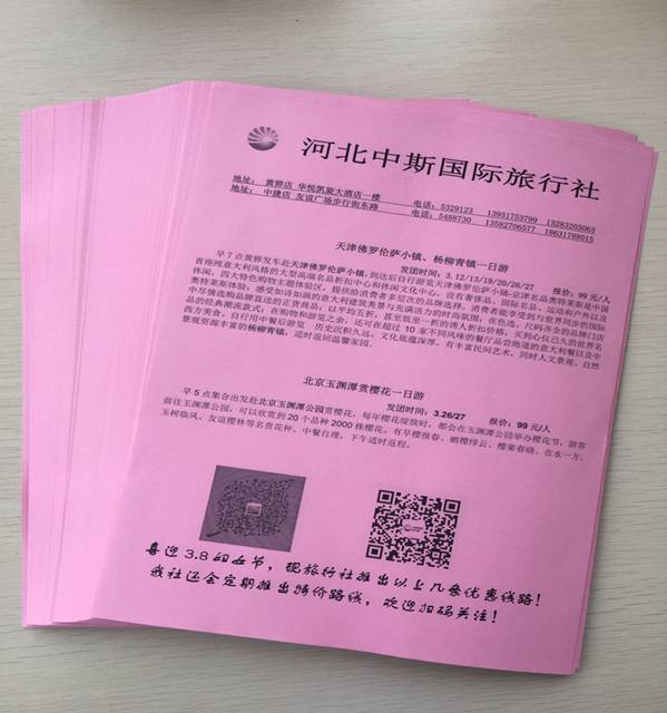 春季正是花開柳綠、服裝換季的季節,旅行社全體成員談討研究,在三月份每周推出特價旅游團,北京玉淵潭公園賞櫻花一日游,天津佛羅倫薩小鎮、楊柳青古鎮休息購物一日游,為黃驊、中捷百姓提供一個踏青賞花、游、購、娛的服務平臺。