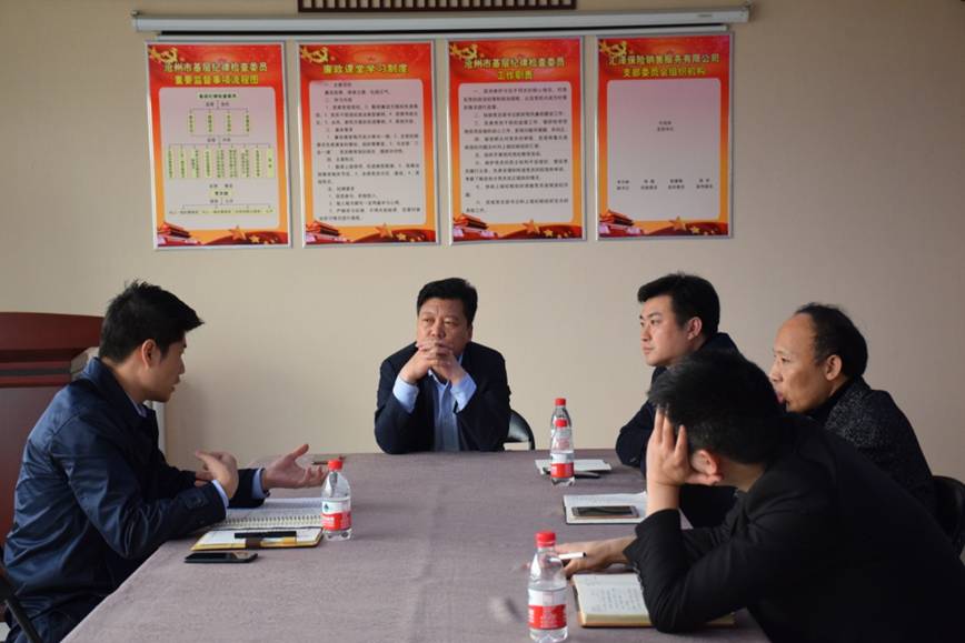 4月10日,黃驊市常務(wù)副市長張劍華,城投公司總經(jīng)理劉愛民, 市金融辦主任王澤生一行蒞臨匯澤保險公司進(jìn)行調(diào)研視察工作,公司董事長牛旭宗,財務(wù)部經(jīng)理冉朋媛陪同接待。
