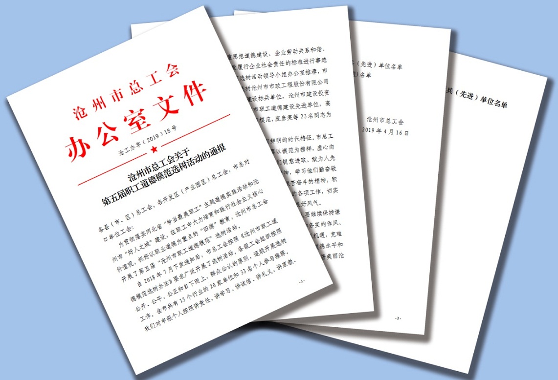 近日,中捷產業園區總工會為新啟元公司頒發了由滄州市總工會授予的“滄州市第五屆職工道德建設先進單位”榮譽稱號,這是新啟元公司繼榮獲“厚德企業”、“先進職工之家”、“模范職工之家”后的又一殊榮。