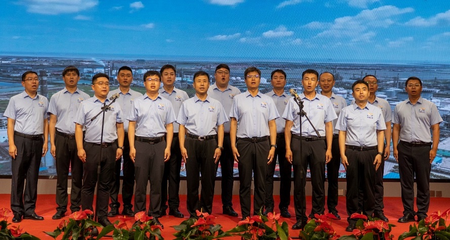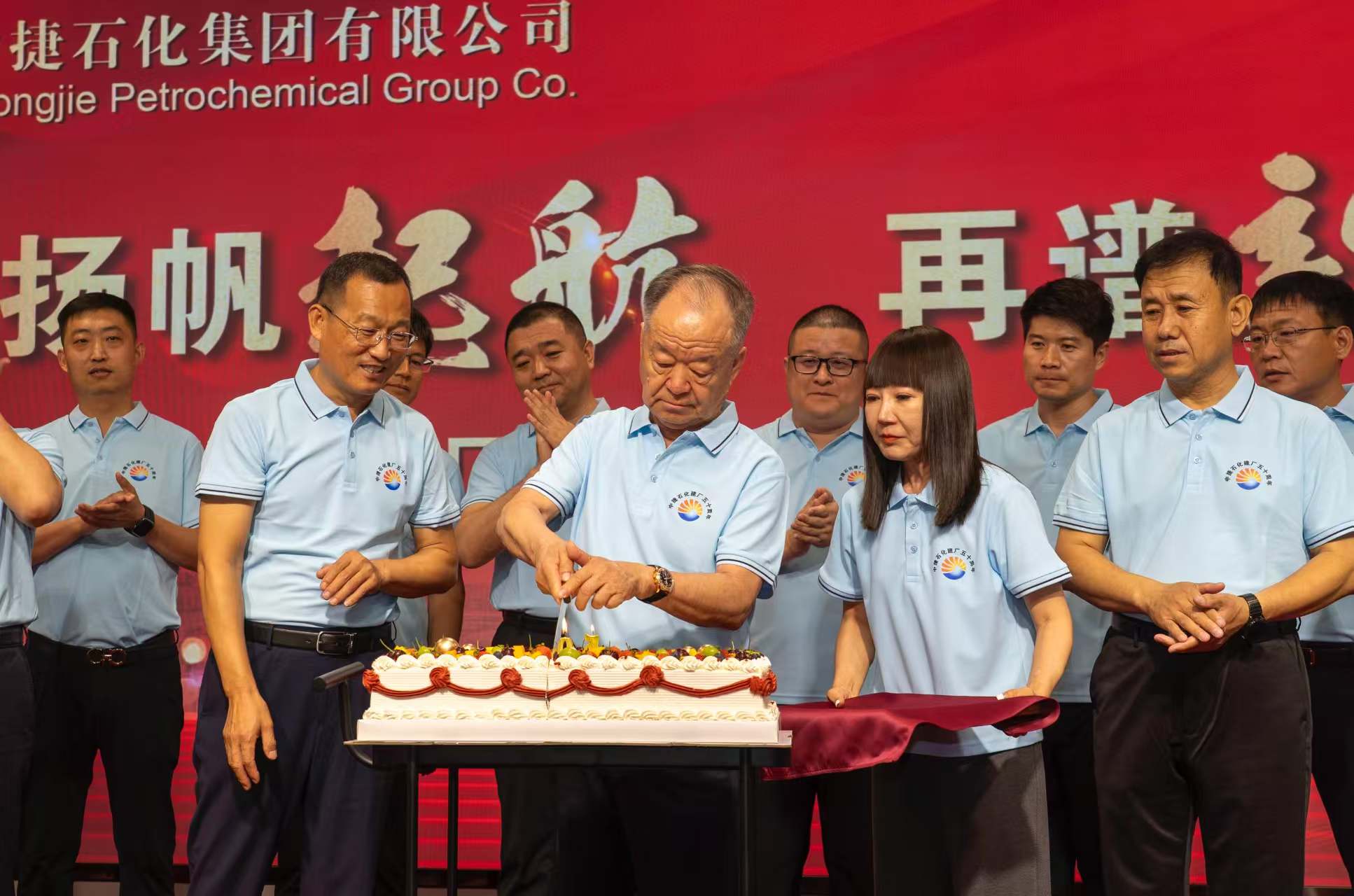隨后,在溫馨而莊重的氛圍中,集團董事長王振華,黨委書記于國臣,總經理喬樹華等集團公司領導,各所屬單位董事長、總經理共同上臺,全場齊唱生日歌,為中捷石化50歲生日獻上最美好的祝福。