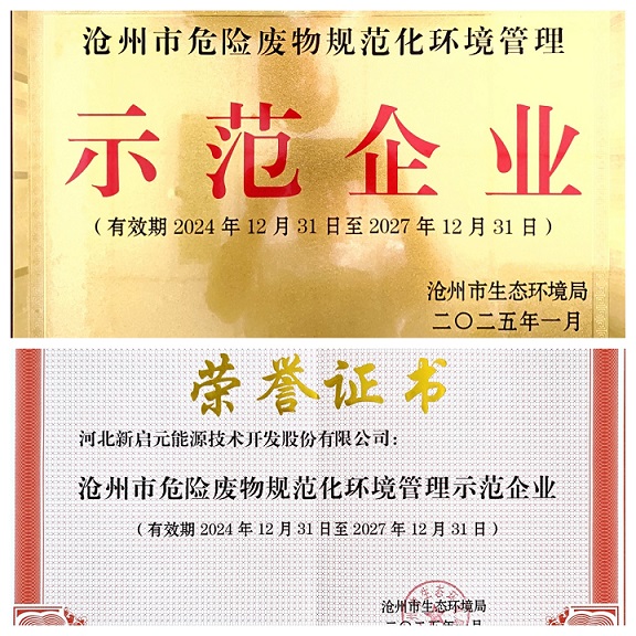 新啟元公司一直重視環境保護工作,在中捷產業園區作為行業標桿被表揚和推廣,曾組織園區涉危險廢物企業負責人來我廠觀摩參觀。2024年滄州市生態環境局組織對全市涉危險廢物企業的評估評審,歷經幾輪檢查,我公司一直名列前茅,最終被滄州市生態環境局評為“滄州市危險廢物規范化環境管理示范企業”。