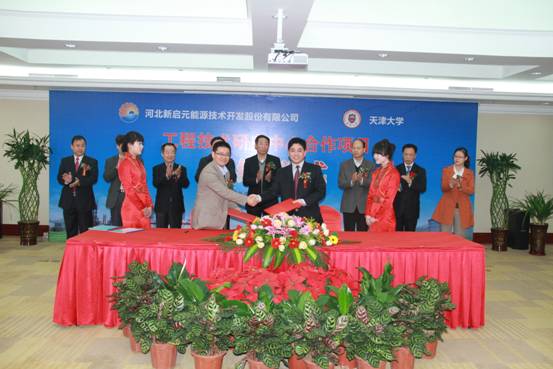 儀式上,河北新啟元能源技術開發股份有限公司總經理喬樹華與天津大學科技處處長楊明海代表雙方簽定了工程技術研究中心項目合作協議。