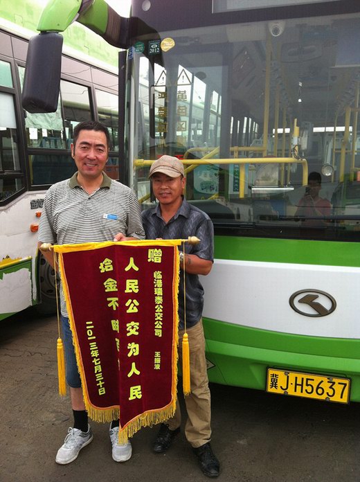 李先生當(dāng)時就很激動,立即拿出錢來感謝駕駛員王振波,王師傅說啥也不收,他說這是公交駕駛員起碼的職業(yè)道德。在8月5日早上,李先生又特地來到公司,將一面印有“人民公交為人民,拾金不昧百姓夸”的錦旗送到駕駛員王振波師傅的手里。